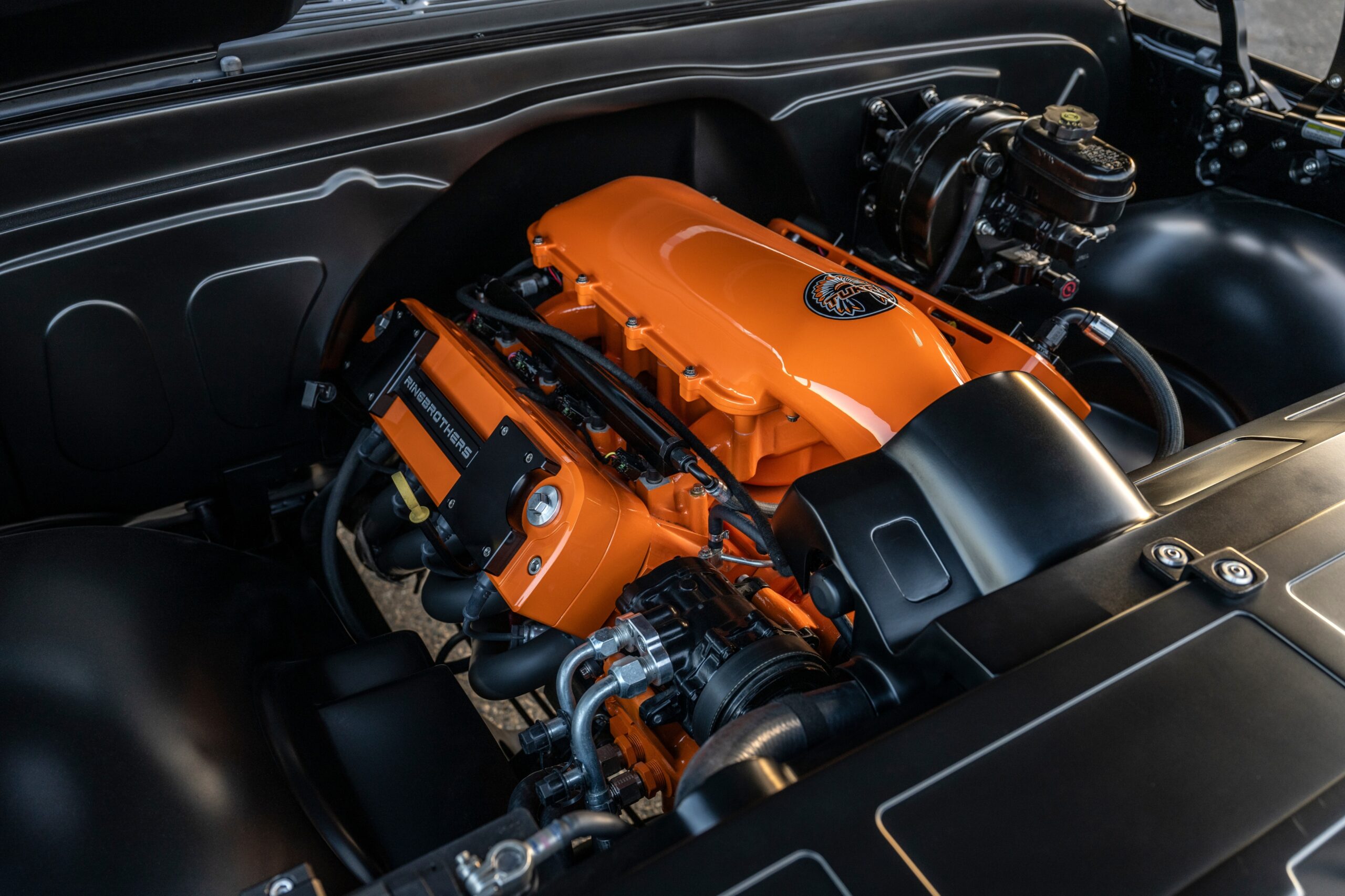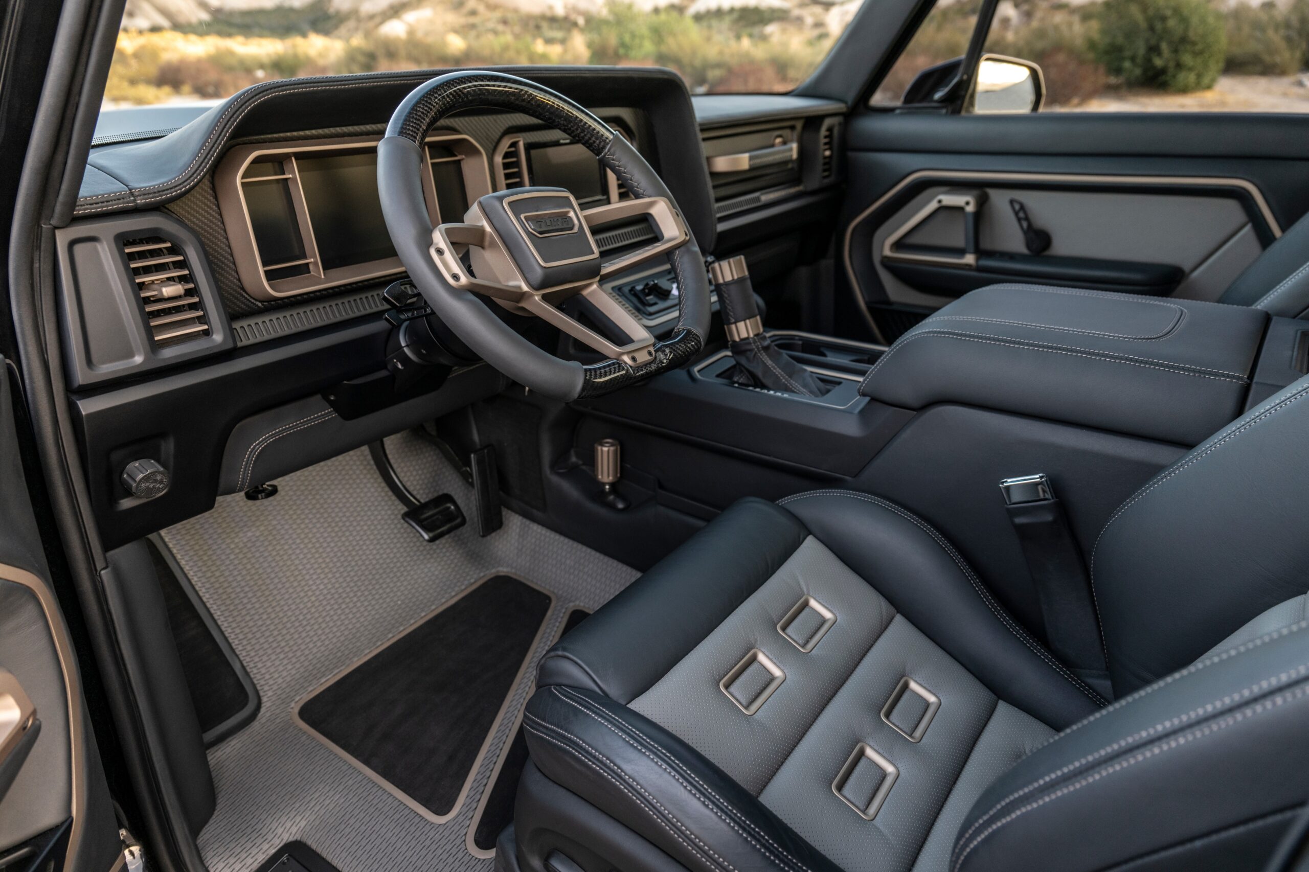 La cabina tecno-utilitaria, completamente a medida, fue diseñada por el diseñador Sean Smith y elaborada por Gabe Lopez y el equipo de Gabe’s Custom Interiors. El tablero de instrumentos de fibra de carbono alberga la instrumentación de Dakota Digital, así como un tablero de instrumentos mecanizado en palanquilla e impreso en 3D, selector de marchas, freno de mano y un panel de instrumentos de fibra de carbono. volante.