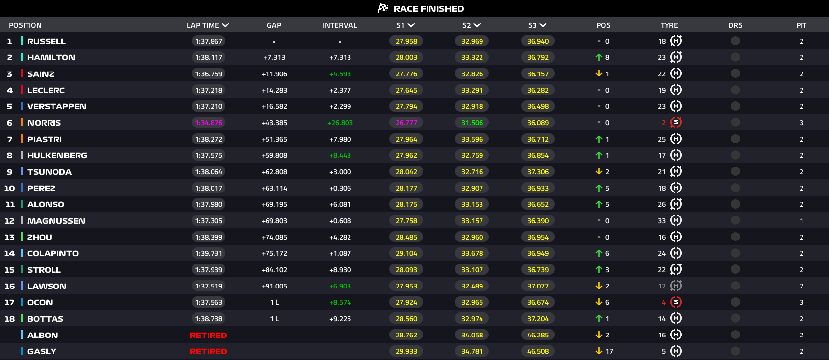 - Como desde el inicio del fin de semana, el coche que más se siente cómodo en este circuito ha sido sin duda el Mercedes . George Russell marcó su ritmo al frente de la carrera, mientras que Lewis Hamilton volvió al pelotón hasta el punto de estar en la lucha por el podio. Tras adelantar a Verstappen y una segunda parada de Leclerc, el siete veces campeón se encontró en segunda posición detrás de su compañero de equipo. A pesar de marcar un ritmo increíble, Hamilton no pudo compensar todo su déficit.