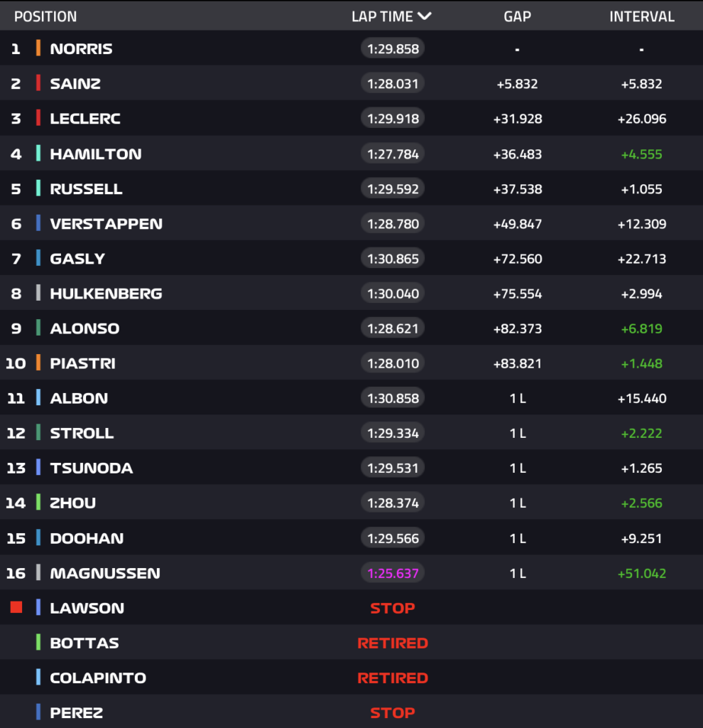 Este Gran Premio de Abu Dabi fue también el Gran Premio del último para algunos… y para la mayoría, su final de carrera fue prematuro. Sergio Pérez, cuyo futuro en  Red Bull  se oscurece, no completó la primera curva y se retiró tras una colisión con  Valtteri Bottas en la chicana de las curvas 6-7. En su último Gran Premio con Sauber, el finlandés volvió a “distinguirse” en la vuelta 31, golpeando a Kevin Magnussen … ¡en la misma chicana que a Sergio Pérez! Valtteri Bottas se vio obligado a retirarse debido a una rotura de suspensión. Franco Colapinto también se retiró por última vez con  Williams , tras sufrir un pinchazo al inicio de la carrera tras ser golpeado por Oscar Piastri.