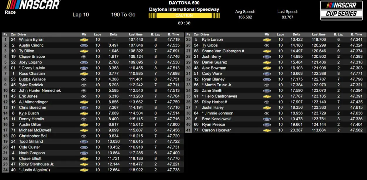 En la octava vuelta, Dillon también pasó a la segunda fila, ahora central, entregando el testigo a William Byron, que lideró las últimas 2,5 millas de la carrera antes de que los oficiales de la carrera llamaran a la bandera amarilla ya que la lluvia había aumentado en intensidad, aunque apenas era visible en el radar y era solo un avance del frente más pesado. Tras dos vueltas detrás del pace car , la inevitable bandera roja mientras esperamos que pase esta tormenta, impulsada por los fuertes vientos. El único que sonríe es Carson Hocevar, el único que se desprendió del grupo compacto por problemas con la bomba de gasolina y que ahora podrá reparar los daños tras la bandera roja y reincorporarse al grupo.