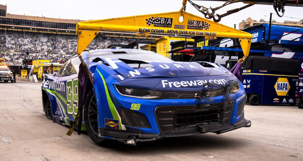 A solo 10 vueltas del final de la Etapa 2 de la Ambetter Health 400, Elliott se encontraba en la posición 11.º en las curvas 3 y 4 en el carril alto de una situación de tres en línea, mientras que Ricky Stenhouse Jr. y Chase Briscoe corrían a su izquierda. El auto de Briscoe se estrelló contra el Chevrolet de Stenhouse, lo que envió a Elliott contra la barrera SAFER.