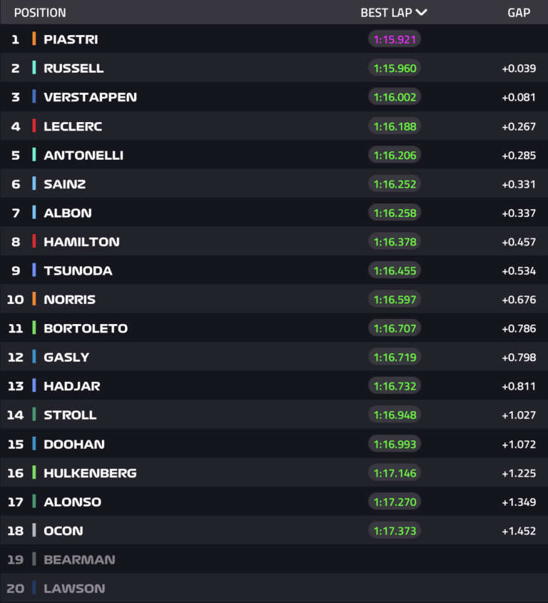 En una sesión muy rápida con los competidores en los preparativos finales antes de la clasificación, todos pudieron dar su opinión. Max Verstappen y Oscar Piastri intercambiaron el liderato varias veces, mientras que George Russell también se unió a la contienda. El inglés incluso encabezó la tabla de tiempos durante un rato antes de perder finalmente ante el piloto local del fin de semana. Así, con una mejor vuelta de 1’15″921, a solo 6 milésimas de la pole position del año pasado, Oscar Piastri terminó en cabeza por delante de George Russell por 0″039 y Max Verstappen por 0″081. Cabe destacar que el holandés estaba en camino de desbancar a su homólogo de McLaren de la primera posición, pero terminó regresando a su garaje después de un ligero error en el último sector. Charles Leclerc y Andrea Kimi Antonelli completaron el top cinco por delante del sorprendente Williams con Carlos Sainz 6º y Alex Albon 7º.