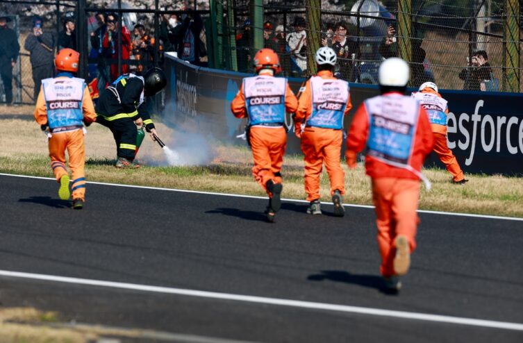Tras el caso de China en 2024, también esta mañana, durante los entrenamientos libres del GP de Japón 2025, se han producido casos de curiosos incendios al borde de la pista, provocados por una mezcla de elementos. La primera son las chispas liberadas por los monoplazas que pasan, la segunda es el fuerte viento en Suzuka que contribuyó a que estas chispas cayeran sobre una superficie de hierba muy seca.