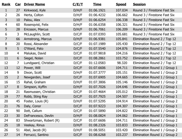 El amplio margen de 0,5 segundos degradó a Palou al segundo lugar, y con la última carrera de su compañero de equipo en Andretti, Colton Herta, Palou cayó otro lugar mientras Herta produjo una vuelta que fue lo suficientemente buena como para capturar una primera fila solo para Andretti, pero quedó a 0,2311 segundos del trabajo estelar de Kirkwood.