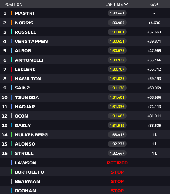 Para Bearman, fue el motor Ferrari de su VF-25 el que de repente dejó de funcionar: un problema que también afectó al Sauber de Gabriel Bortoleto, también equipado con el propulsor italiano. Los dos hombres se han retirado, al igual que sus compañeros debutantes esta temporada, Jack Doohan (Alpine) y Liam Lawson (Racing Bulls).