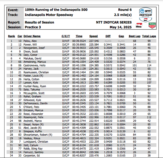 Todas las vueltas rápidas de hoy se lograron gracias a la ventaja aerodinámica de los vehículos líderes, ya que los equipos siguieron concentrándose en encontrar configuraciones estables en el tráfico para el día de la carrera. Pero con la clasificación de PPG Presents Armed Forces a solo tres días, cabe destacar que Kyle Kirkwood fue el más rápido corriendo en solitario por segundo día consecutivo, alcanzando 222.760 en una vuelta en solitario con el Siemens Honda n.° 27 de Andretti Global.