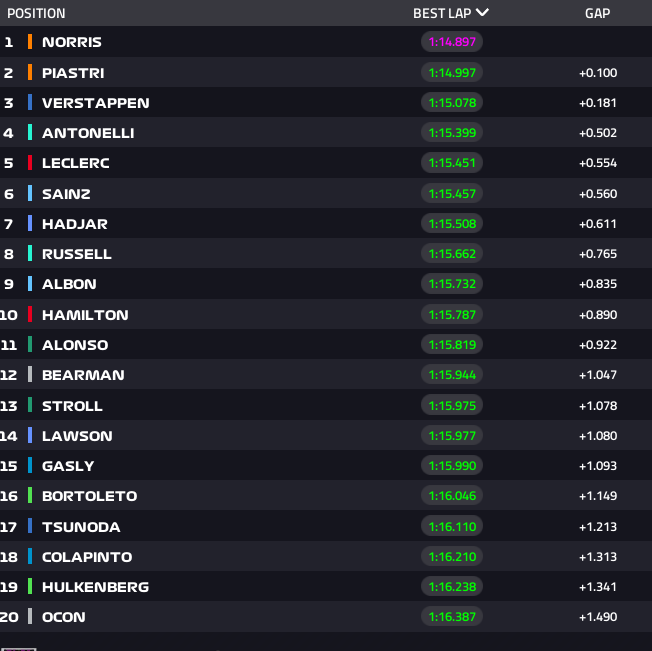 Lando Norris es quien, por el momento, mejor ha entendido sus neumáticos, firmando un último sector supersónico para adelantar a su compañero Oscar Piastri , que había dominado las dos primeras sesiones celebradas el viernes. Por detrás de Verstappen (3º), Kimi Antonelli también se mostró cómodo con los neumáticos C6 para marcar el cuarto mejor tiempo por delante del Ferrari de Charles Leclerc y del Williams de Carlos Sainz.