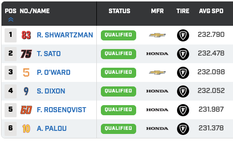 Si bien se esperaban los autos del Team Penske y del Chip Ganassi Racing, ninguno de ellos estará en la primera fila. El dos veces ganador de la Indy 500, Takuma Sato (Rahal Letterman Lanigan Racing), se clasificó segundo, por delante de Pato O’Ward (Arrow McLaren). Por tanto, tendremos que mirar a la segunda fila para encontrar a Scott Dixon y Álex Palou (Chip Ganassi Racing), que rodean a Felix Rosenqvist (Meyer Shank Racing). El sueco había marcado el tiempo más rápido en el Fast 12, pero no pudo mejorar su rendimiento en el Fast 6.