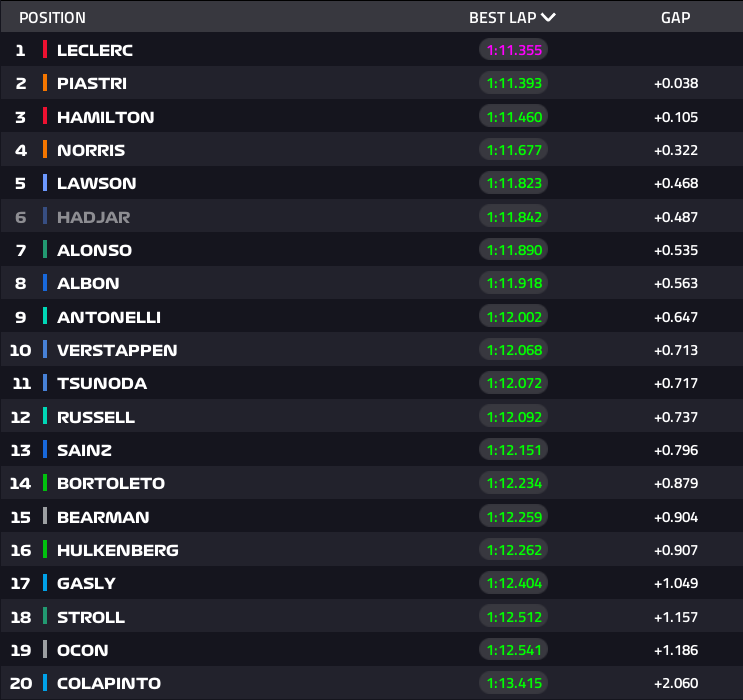 En comparación con el ligero bloqueo de Max Verstappen, las desventuras de Isack Hadjar fueron mucho más problemáticas. Al inicio de la sesión, el francés golpeó la Nueva Chicane a la salida del túnel, dañando directamente su eje trasero derecho y reventando su neumático en el proceso. Finalmente capaz de reiniciarse después de este desafortunado incidente, el piloto de Racing Bulls golpeó las barreras por segunda vez, en el exterior de la primera curva después del ecuador de la sesión. Al impactar contra la barrera en el mismo punto con su monoplaza, el piloto francés tuvo que finalizar prematuramente una sesión para olvidar. Sin embargo, terminó en un excelente sexto lugar, justo detrás de su compañero de equipo Liam Lawson, quien fue quinto.