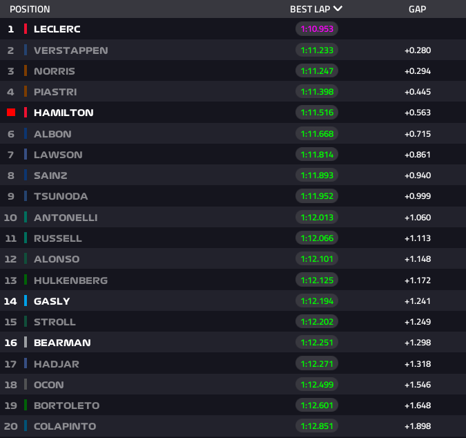 El cuatro veces campeón del mundo, sin embargo, no está del todo satisfecho con su auto y se queja de la falta de agarre, con las cuatro ruedas patinando a veces. Su compañero de equipo Yuki Tsunoda, que firmó una sesión positiva (9º), también señaló la inestabilidad de su monoplaza. El equipo Red Bull B sigue teniendo un buen rendimiento, en particular gracias a Liam Lawson, que vuelve a situarse entre los diez primeros (7º) tras acabar 5º en la FP2 el viernes. Isack Hadjar tuvo más dificultades para coger confianza y tuvo que conformarse con el 17º puesto, justo por delante de Esteban Ocon. El tercer piloto francés, Pierre Gasly, terminó 14º después de otra sesión en la que Alpine tuvo problemas.