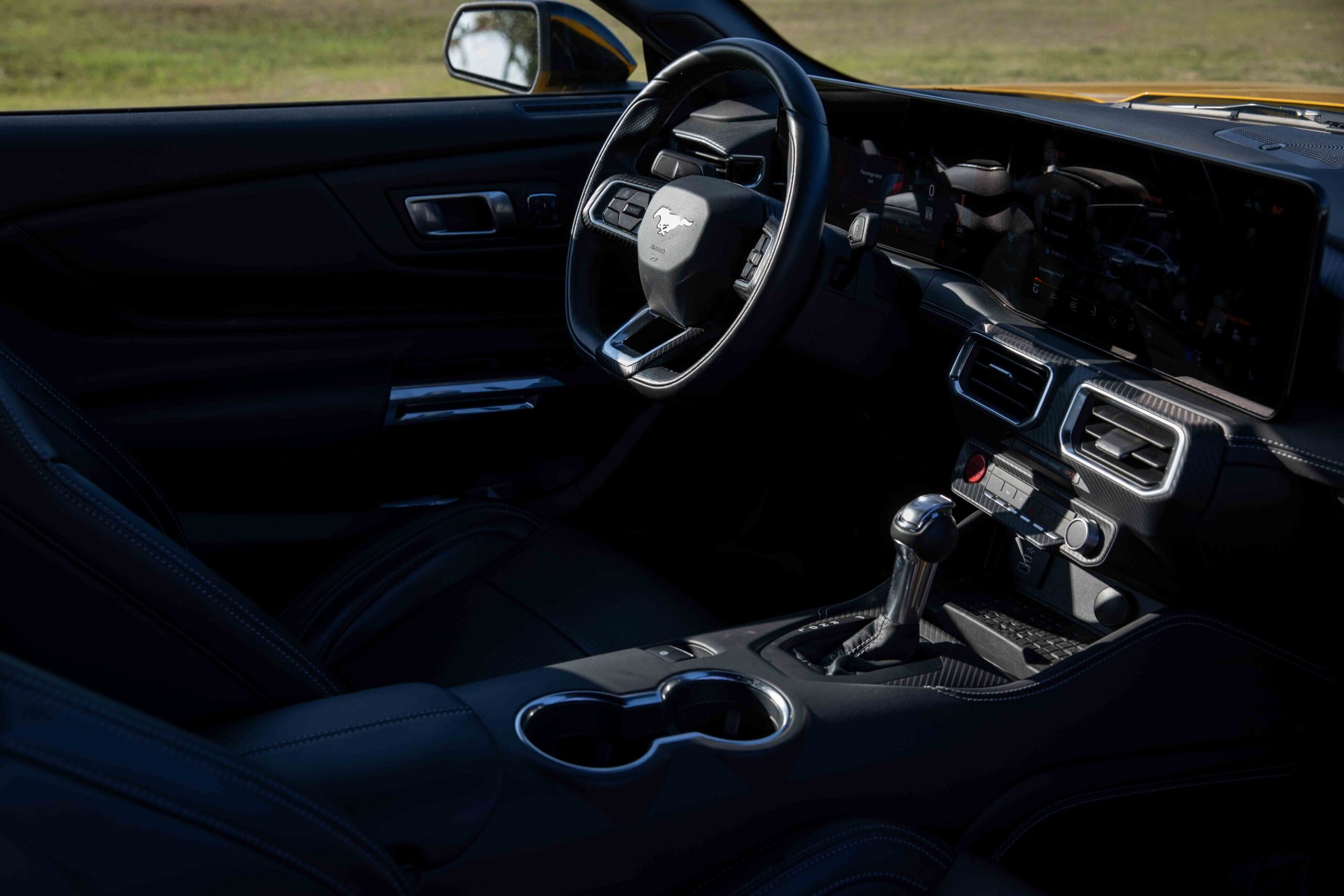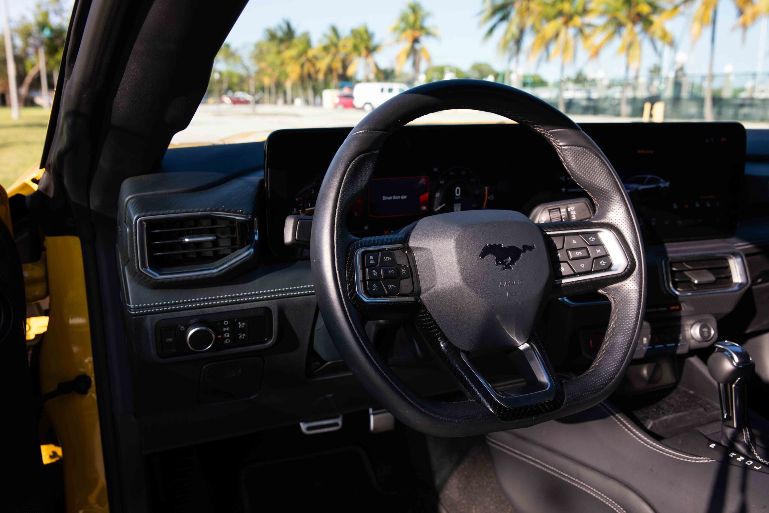 El interior del Mustang Convertible 2024 ha sido completamente renovado, con un claro enfoque en la tecnología y el confort. Ahora, el tablero cuenta con una pantalla táctil central de 13.2 pulgadas, compatible con Apple CarPlay y Android Auto. Adicionalmente, el panel de instrumentos digital de 12.4 pulgadas ofrece múltiples opciones de personalización, permitiendo al conductor ajustar la información a su gusto. La interfaz es intuitiva y moderna, marcando una clara distancia del diseño clásico de Mustangs anteriores.