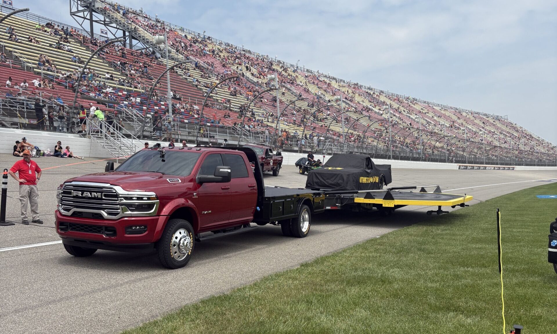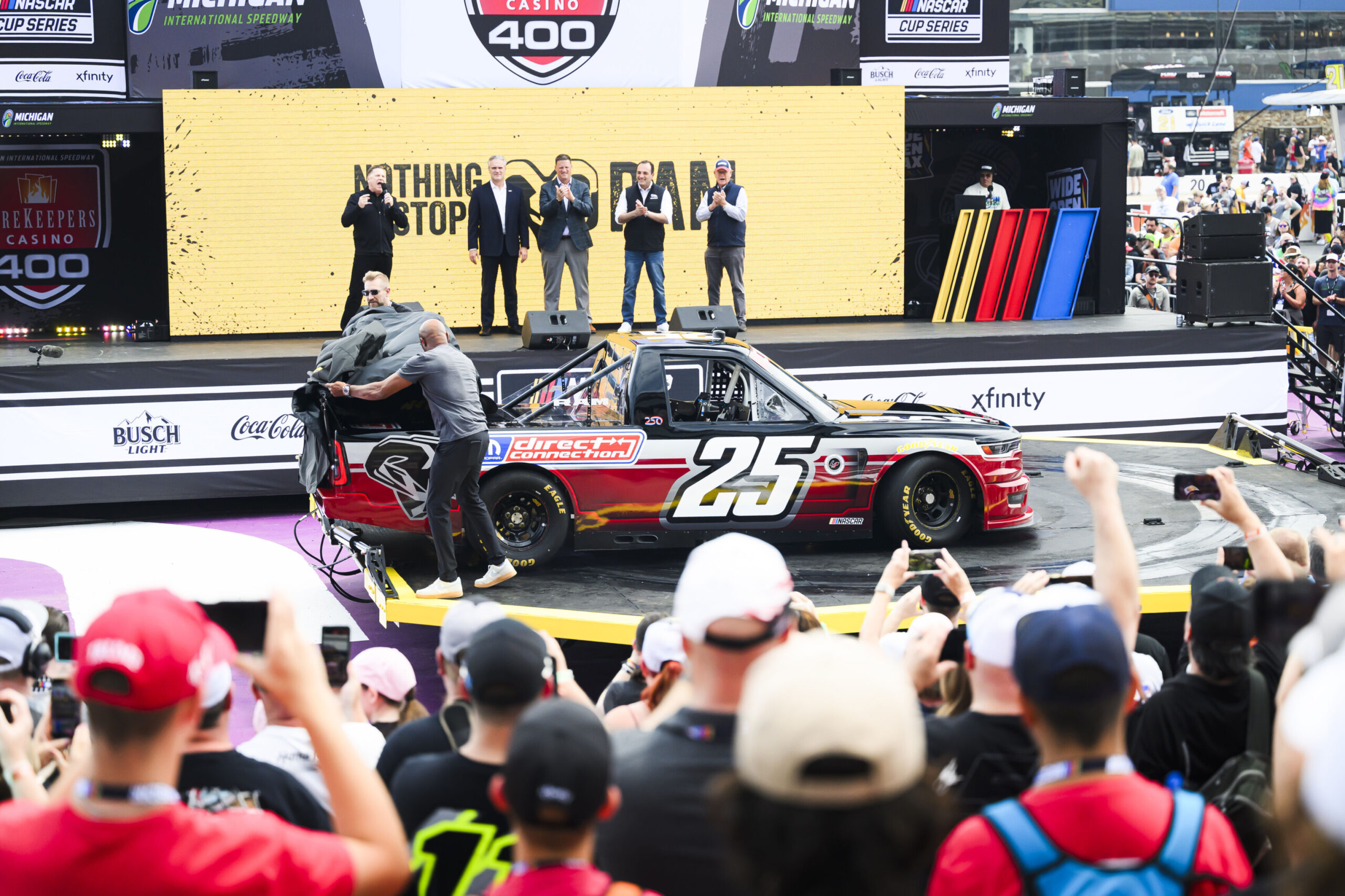 La noticia del regreso de Ram a la NASCAR fue anunciada oficialmente por Tim Kuniskis, director ejecutivo de la marca Ram, durante un evento en vivo de la NASCAR en el Michigan International Speedway este fin de semana. Entre los momentos más impactantes se encontraba una Ram 5500 con un remolque personalizado, construido específicamente para donas ahumadas, cortesía del prototipo de camioneta de Ram para la NASCAR. Anderson Silva, ícono del Salón de la Fama de la MMA, salió a la pista para lanzar camisetas con la marca HEMI al público.