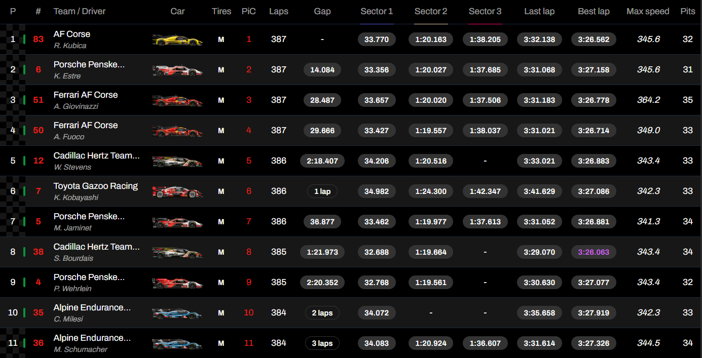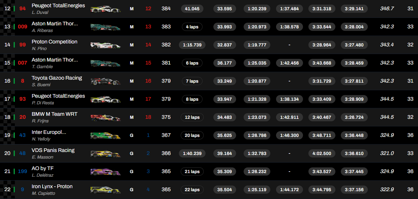 Tras Kubica, Hanson y Ye, el Porsche n.º 6 de Kévin Estre, Laurens Vanthoor y Matt Campbell se alzó con el segundo puesto, por delante del Ferrari n.º 51. Para los fabricantes franceses, estas 24 Horas de Le Mans no fueron una carrera fácil. A diferencia del año pasado, los dos Alpine terminaron la carrera en 10.º y 11.º lugar. Para Peugeot, la marca del león terminó en 12.º y 17.º lugar.