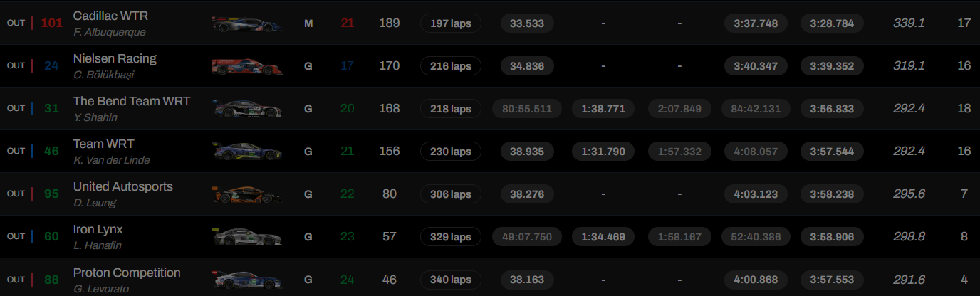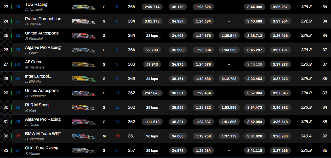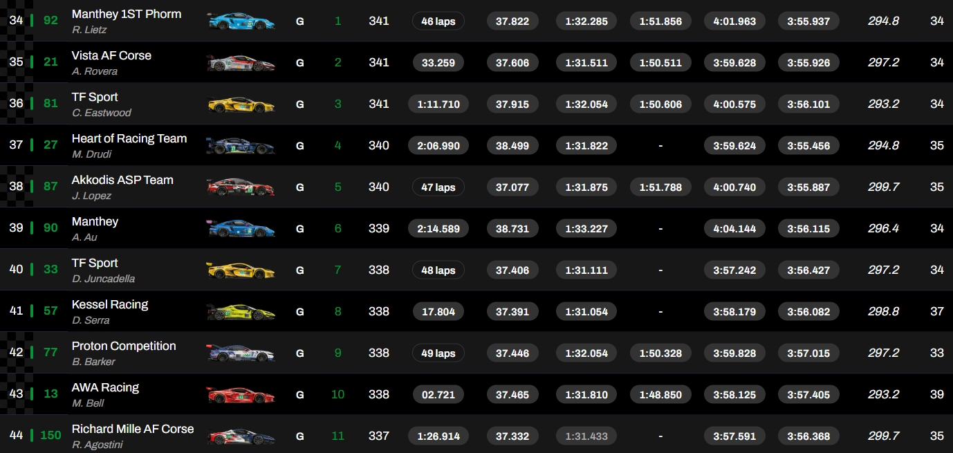 Alessio Rovera, François Hériau y Simon Mann devolvieron el segundo puesto a Ferrari con el 296 LMGT3 nº 21 del equipo Vista AF Corse, mientras que Corvette consiguió el tercer puesto con el nº 81 del equipo TF Sport (Charlie Eastwood, Tom Van Rompuy, Rui Andrade).