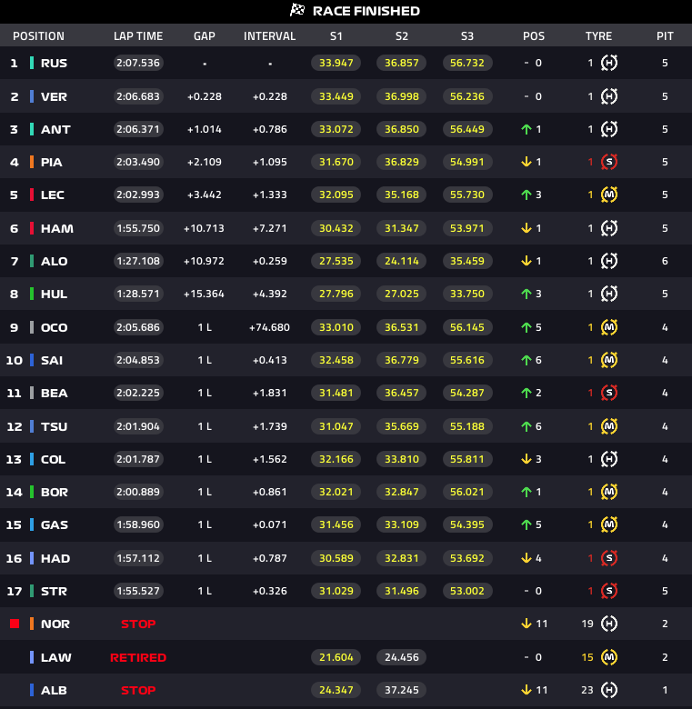 La carrera termina así: Russell le gana a Verstappen, no sin intentar ponerlo nervioso, deteniéndose tras el Safety Car para dejar pasar al holandés. Max es segundo por delante de Kimi Antonelli, quien consigue su primer podio en la F1. Piastri es cuarto por delante de Leclerc y Hamilton.