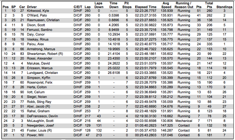 Fue la quinta victoria de Kirkwood en su carrera y su mejor tercera victoria en esta temporada. Pero lo más importante para Kirkwood es que fue su primera victoria en un óvalo tras cuatro victorias en circuitos urbanos.