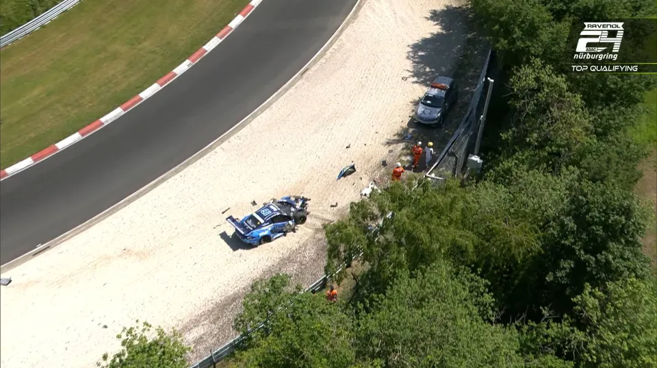 El corredor de Scherer Sport PHX, Laurens Vanthoor, estaba en acción durante la sesión de clasificación superior para la 53.ª edición de las 24 horas de Nürburgring en Schwedenkreuz cuando su Porsche 911 GT3 se salió de la pista a gran velocidad.