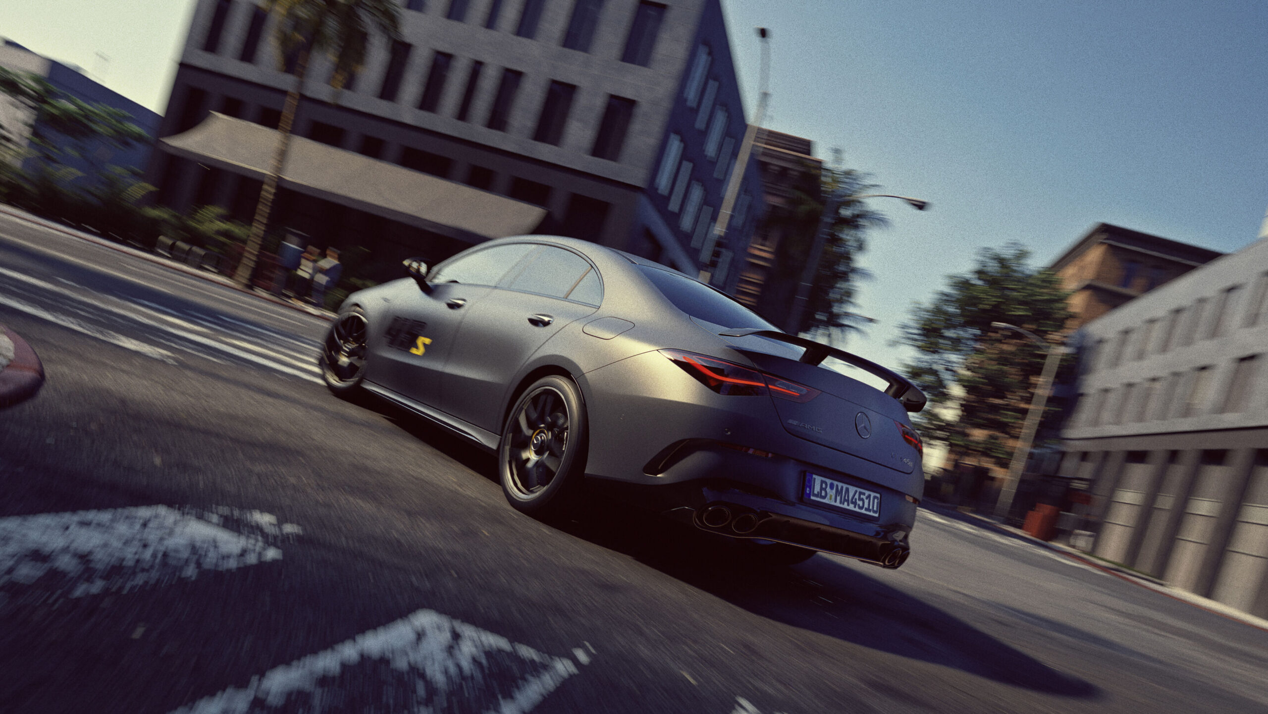 La estética del CLA 45 S «Final Edition» refuerza el carácter agresivo del modelo con una configuración visual exclusiva. Toda la carrocería está pintada en MANUFAKTUR Mountain Grey Magno, un tono mate que se combina con gráficos en negro y amarillo sobre puertas y retrovisores para resaltar la deportividad.