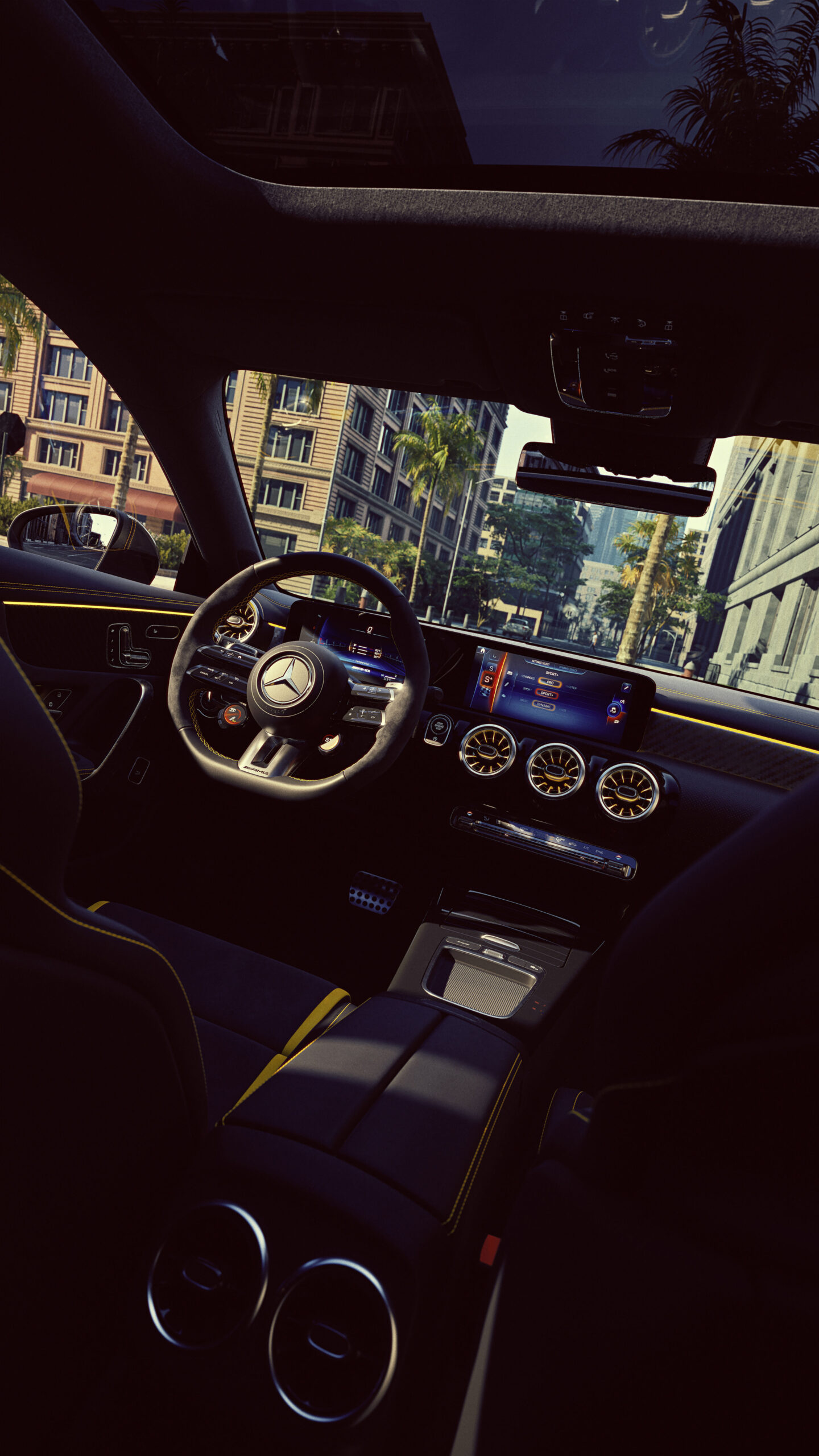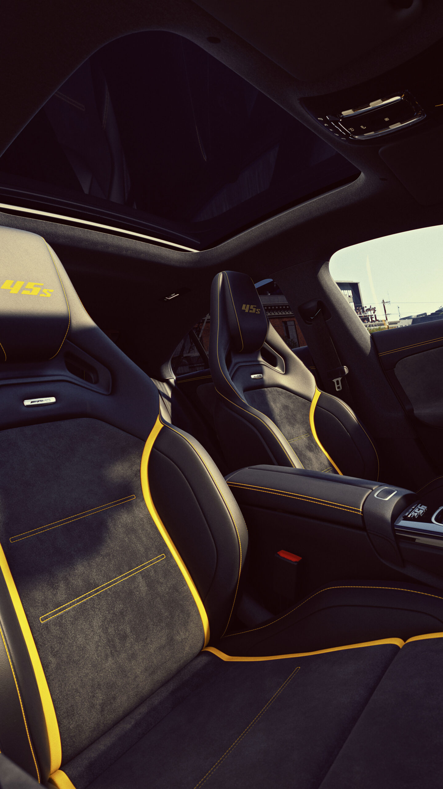 - Asientos AMG Performance tapizados en MB-Tex y microfibra, con costuras amarillas y logotipo “45 S” en los reposacabezas.