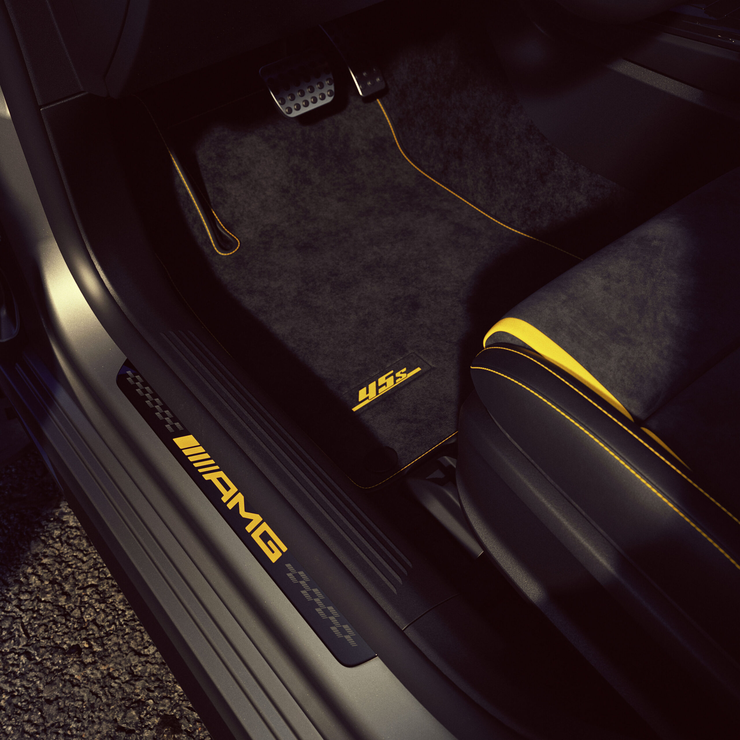 - Alfombrillas AMG con la insignia “45 S” y umbrales iluminados con el logotipo AMG en amarillo.