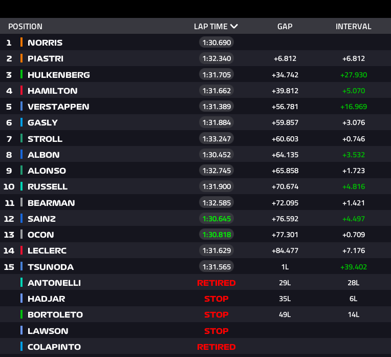 Norris construyó su victoria con paciencia e inteligencia. Durante buena parte de la carrera marchó segundo, pero una penalización a Oscar Piastri tras la segunda intervención del coche de seguridad (provocada por Hadjar) cambió el curso de la competencia. El australiano frenó bruscamente en la resalida, sorprendiendo a Max Verstappen, quien debió esquivarlo de forma riesgosa. Como resultado, el líder del campeonato recibió una sanción de 10 segundos.
