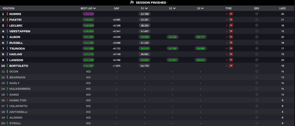 Norris lideró con autoridad la última fase de la sesión, superando tanto a su compañero de equipo Piastri como al Ferrari de Charles Leclerc. Max Verstappen, quien había triunfado en la Sprint más temprano, partirá cuarto en la parrilla del domingo, por delante del siempre competitivo Alex Albon, que volvió a colocar al Williams entre los cinco primeros.