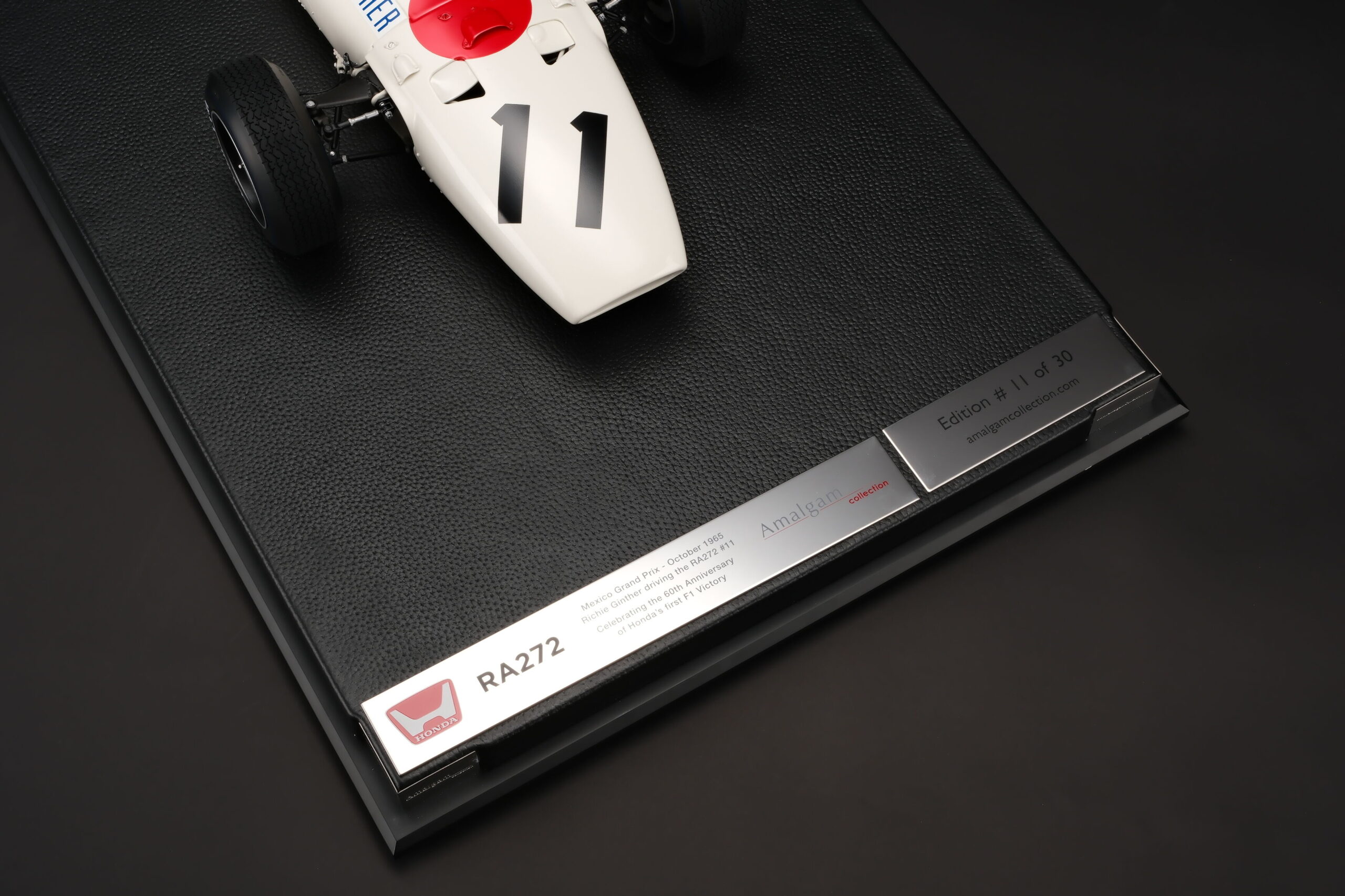 El equipo de Amalgam viajó al Honda Collection Hall en Motegi, Japón, para escanear digitalmente el RA272 original y capturar cada detalle histórico. Con más de 1,600 piezas ensambladas y más de 4,500 horas de desarrollo, cada modelo refleja la decoración auténtica, la carrocería hecha a mano y un motor Honda V12 reproducido con total fidelidad.