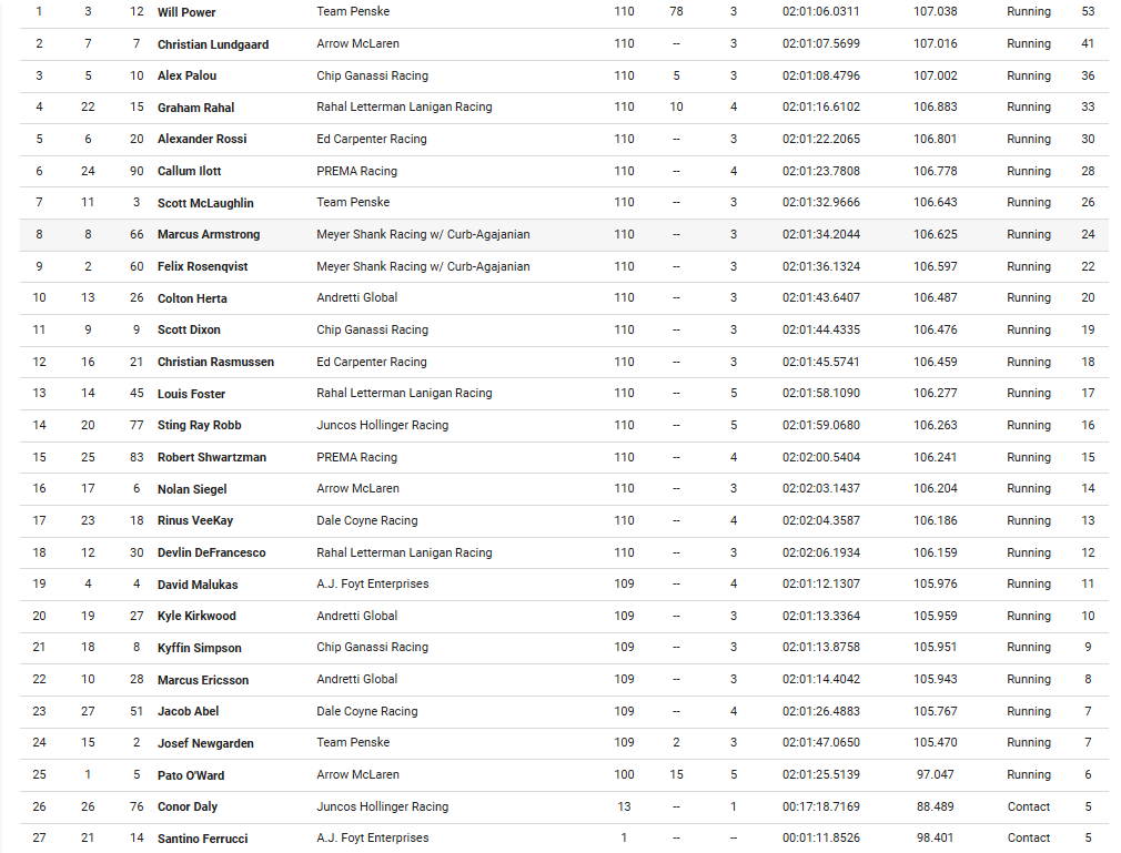 La carrera, de 110 vueltas, se definió en las últimas 30, cuando Power, Lundgaard y Palou protagonizaron una intensa lucha tras las últimas paradas en boxes. Power apostó por una estrategia de neumáticos alternativos más agresiva en los primeros tramos, construyendo una ventaja de 20 segundos, pero en la fase final tuvo que resistir la presión directa de Lundgaard y Palou.