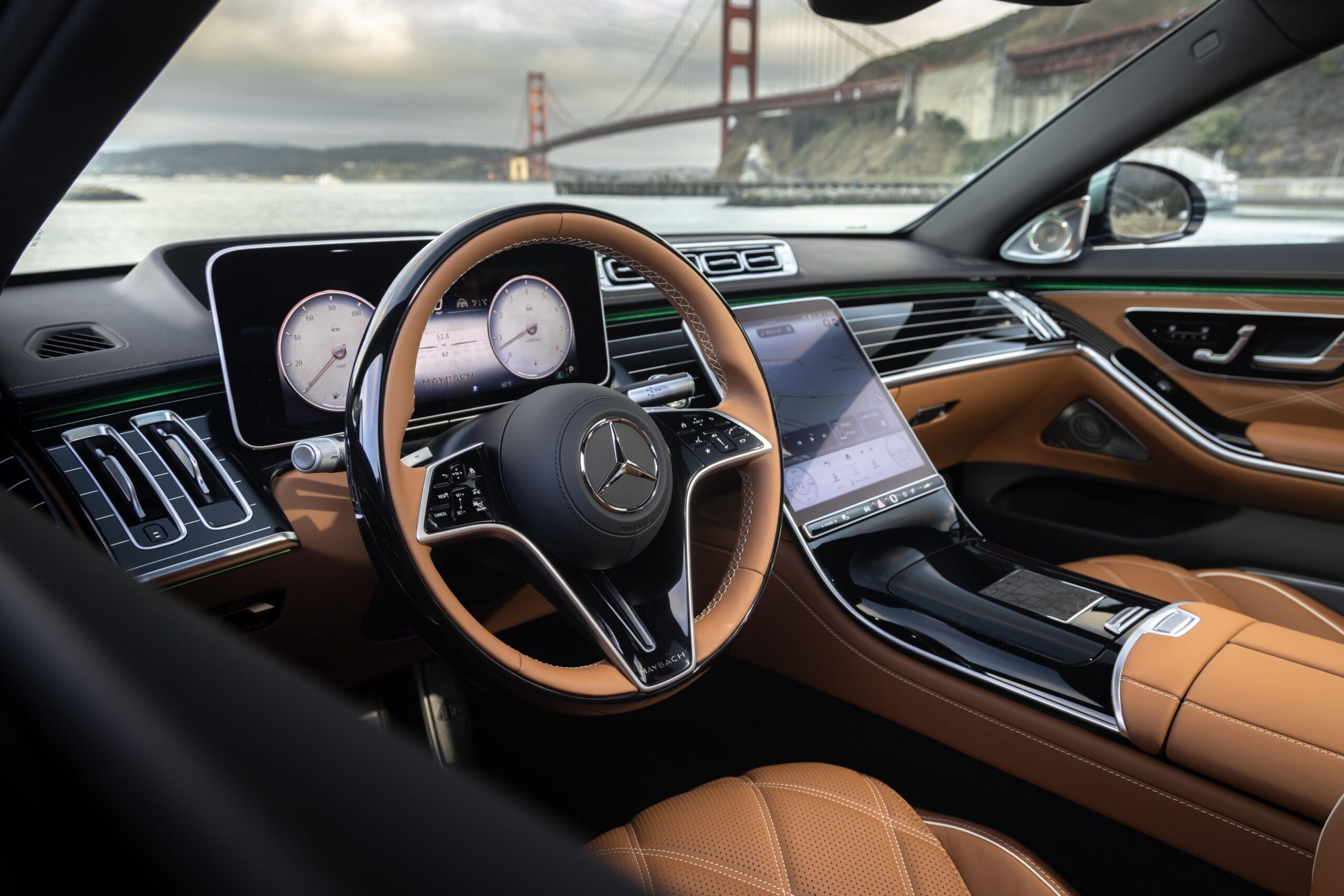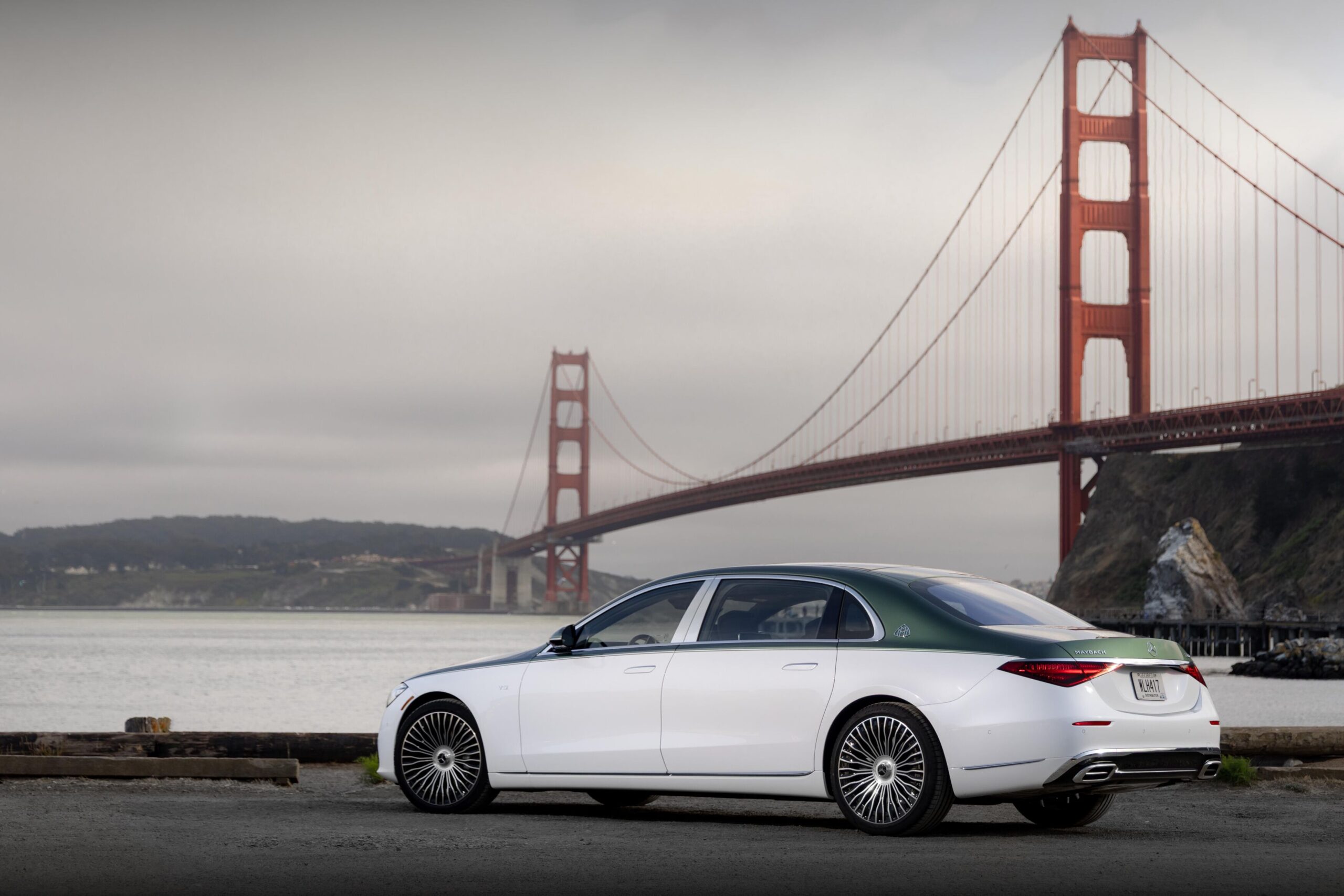 Inspirado en los cipreses de Monterrey y las playas de Pebble Beach, el sedán luce una pintura bitono exclusiva MANUFAKTUR que combina Verde Mid Ireland Metalizado y Blanco Moonlight Metalizado, complementada por detalles cromados y llantas forjadas de 21 pulgadas Maybach Exclusive Champagne Flute Multi-Spoke.