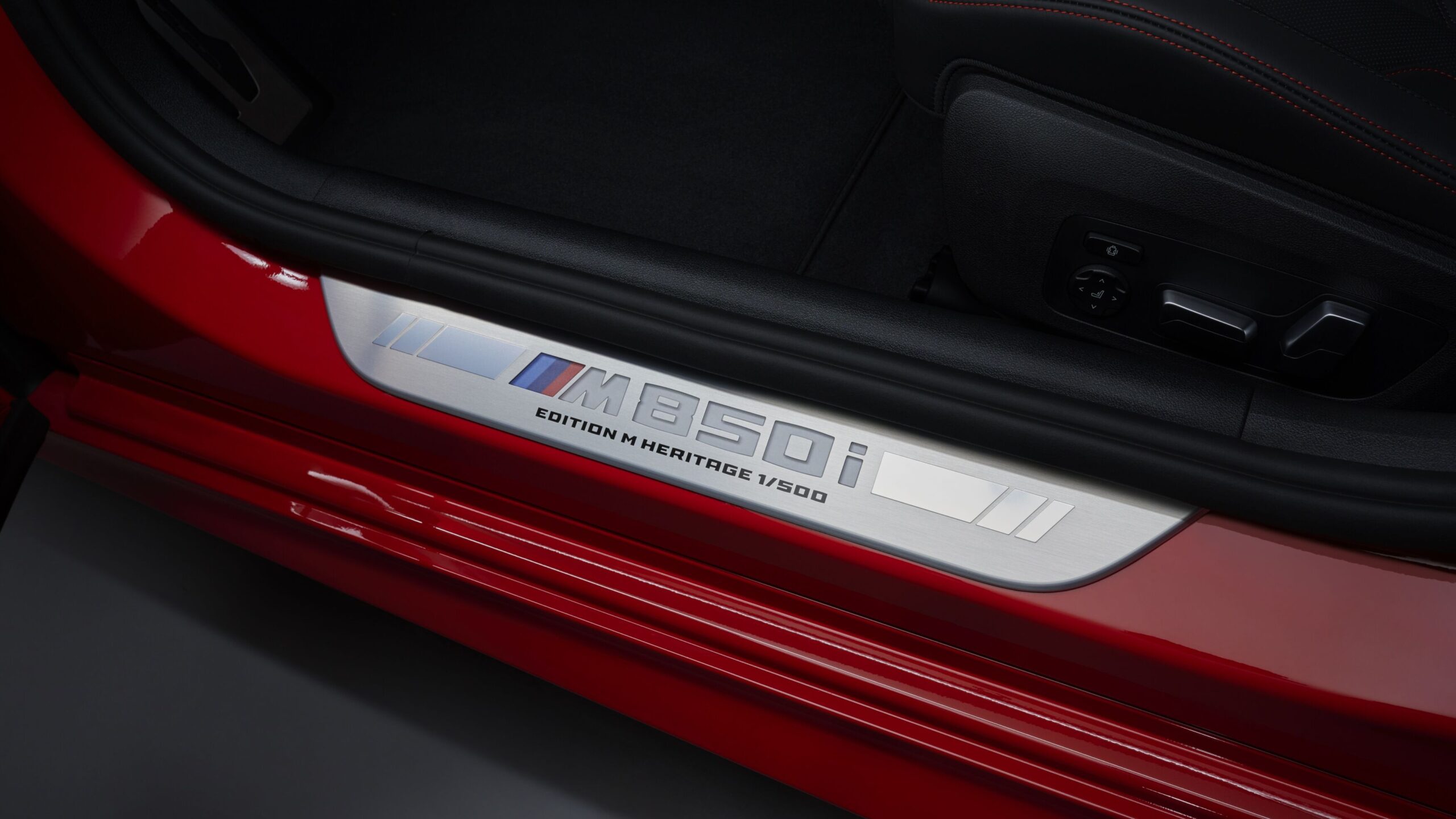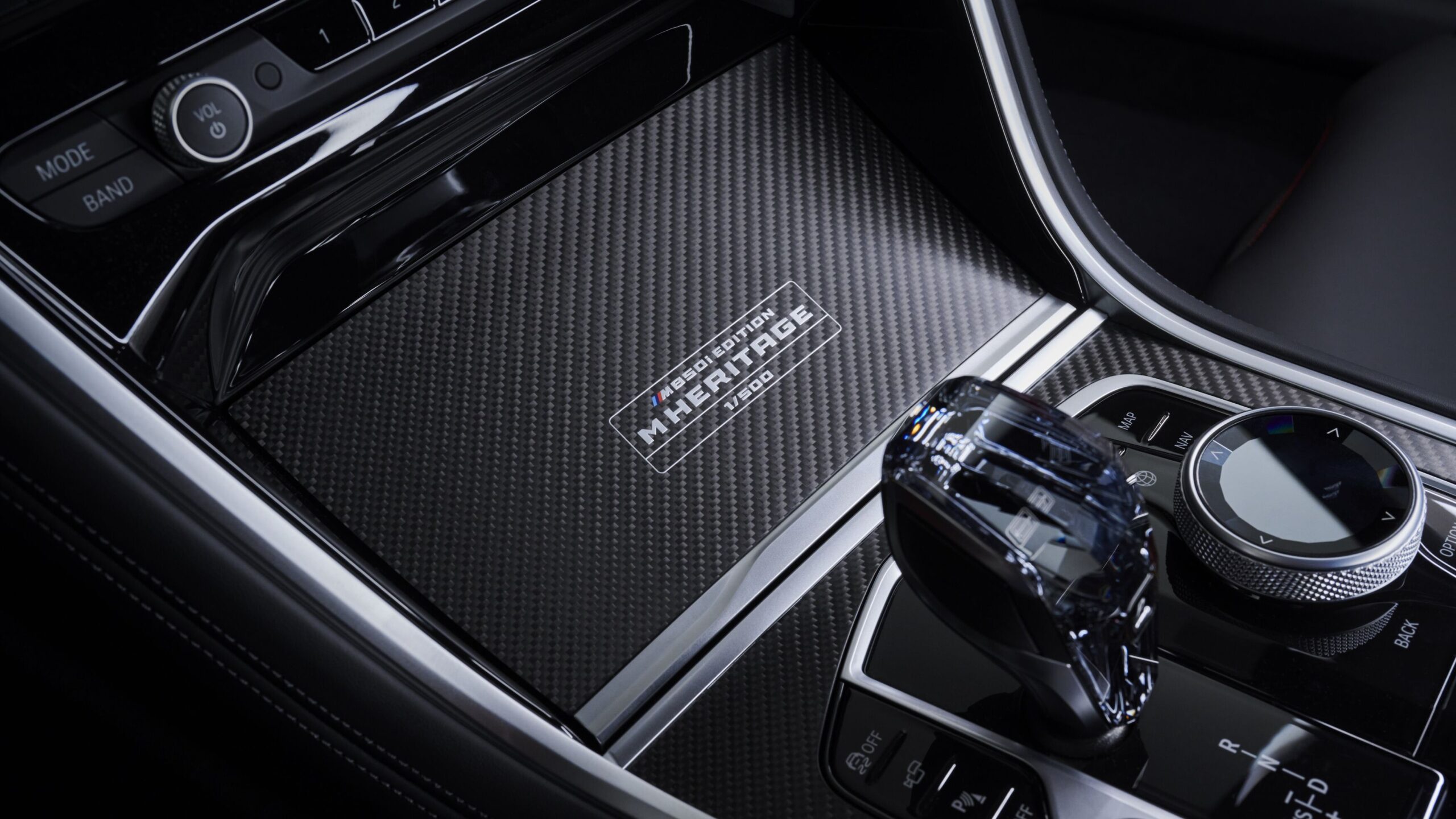 La consola central presenta un exclusivo acabado de fibra de carbono mate. La palanca de cambios de cristal y el control iDrive aportan un toque de elegancia a los detalles interiores, marcadamente deportivos. La cubierta del portavasos y las placas de los umbrales de las puertas llevan la inscripción «M850i Edition M Heritage» y «1/500», para recordar a todos a bordo la rareza de esta Edición.