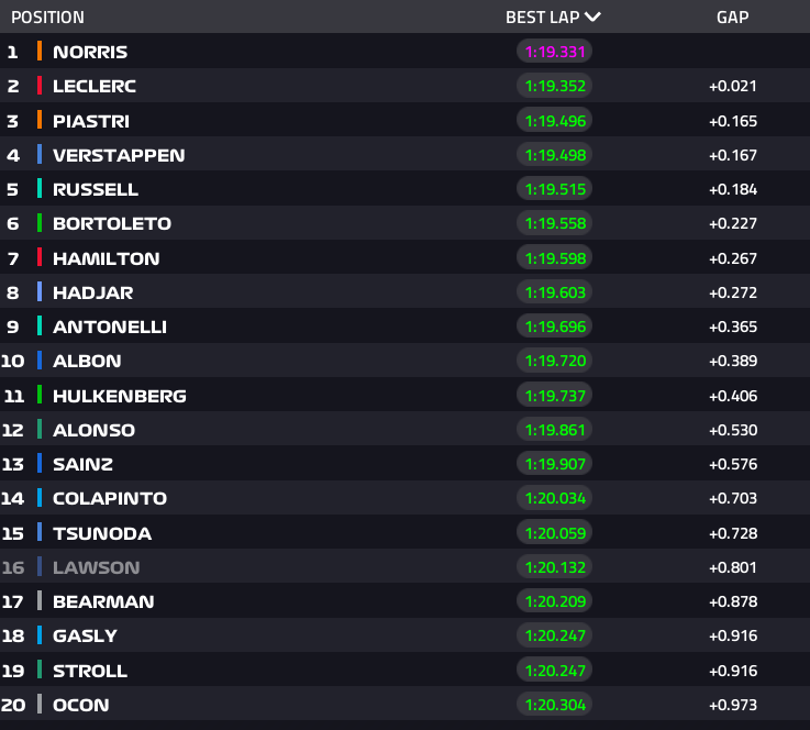 La sorpresa la dio Gabriel Bortoleto, que colocó al Sauber en un notable sexto puesto, incluso por delante de Lewis Hamilton, mientras que Isack Hadjar llevó al Racing Bulls al octavo lugar antes de ser citado por los comisarios por no reincorporarse correctamente tras una salida en Roggia.