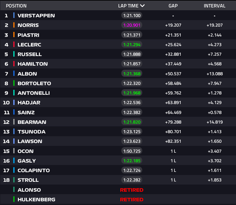 - Pierre Gasly y Franco Colapinto, ambos con Alpine, cruzaron la meta en 16º y 17º, confirmando el fin de semana más difícil para la escudería.