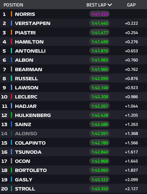 Más atrás, Isack Hadjar se ubicó 11º, seguido por Nico Hülkenberg, Carlos Sainz, Fernando Alonso y Franco Colapinto. Yuki Tsunoda fue 16º tras encontrar tráfico en su última vuelta lanzada, mientras que Esteban Ocon, Gabriel Bortoleto, Pierre Gasly y Lance Stroll cerraron la tabla de tiempos.