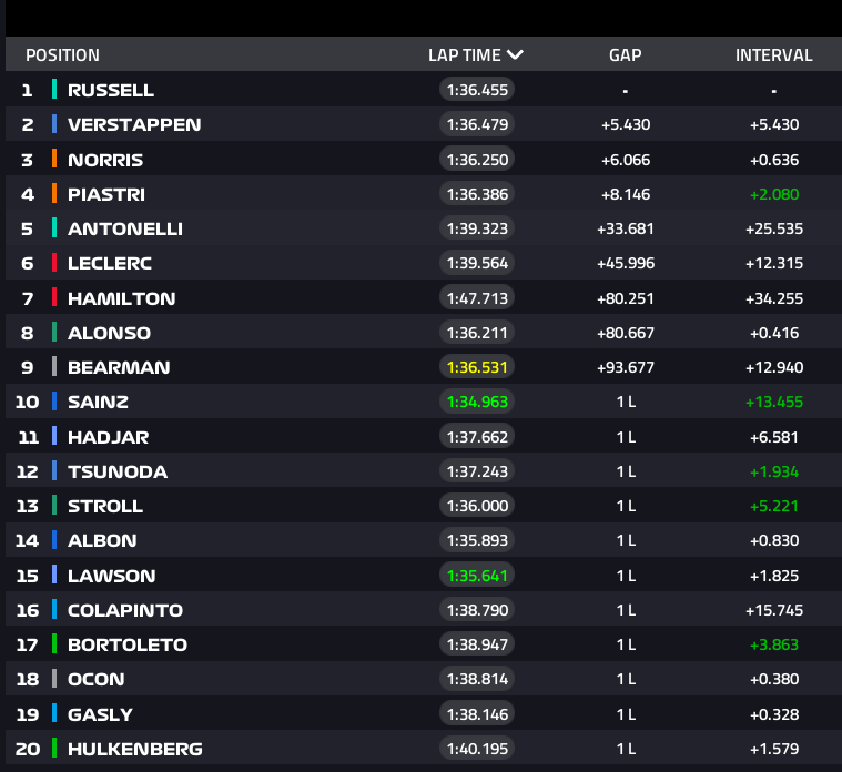 Kimi Antonelli completó un sólido quinto lugar tras superar a Charles Leclerc, mientras Lewis Hamilton fue séptimo luego de sufrir un fallo en los frenos al final de la carrera. El británico, además, está bajo investigación por límites de pista.