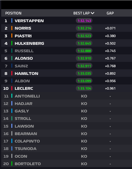 La primera ronda (SQ1) terminó con caos total en el tráfico. Varios pilotos quedaron atrapados sin poder completar su última vuelta rápida: Bortoleto, Colapinto, Ocon, Bearman y Tsunoda quedaron fuera al no cronometrar a tiempo.