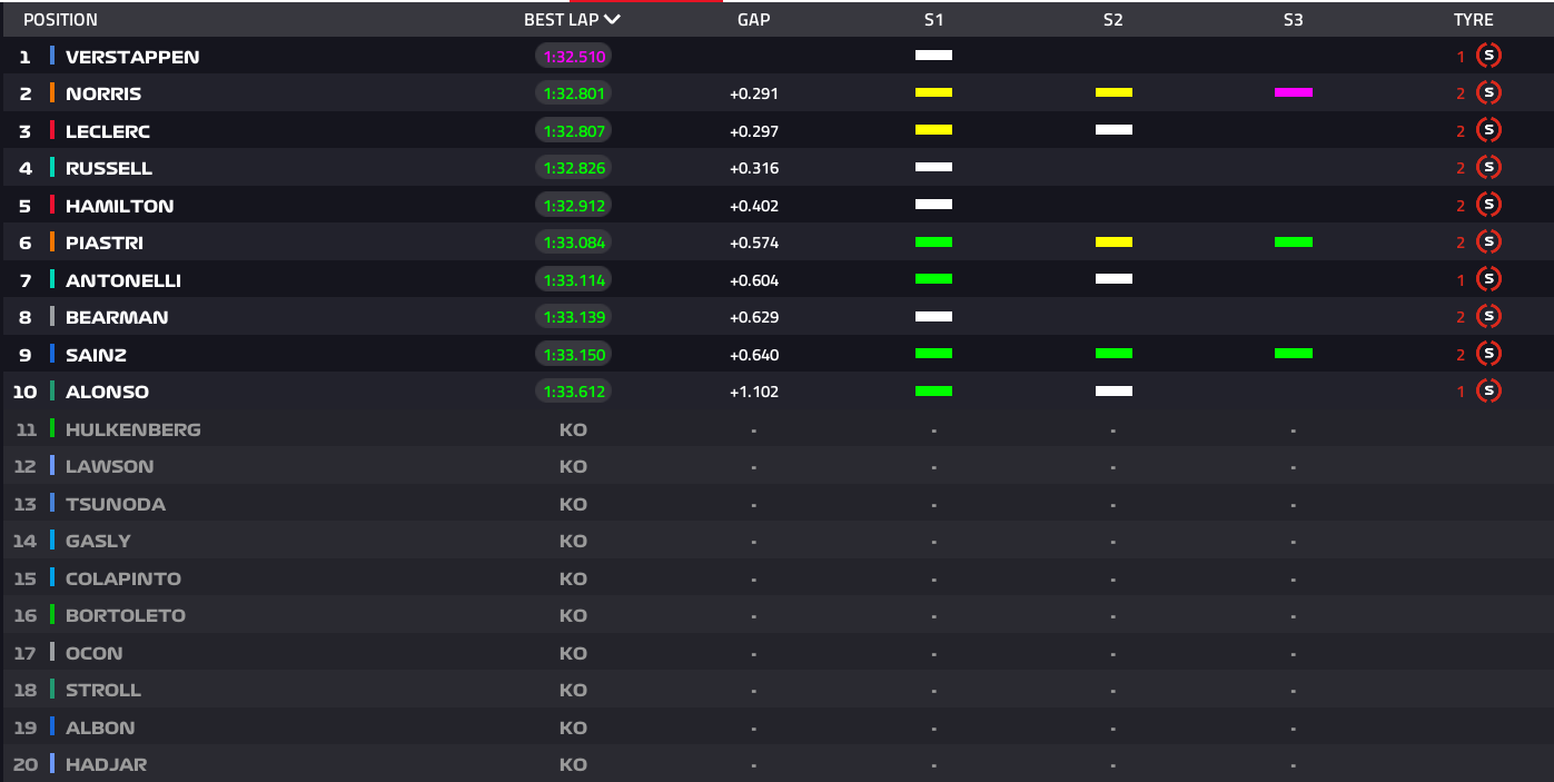 Al cierre de la Q1 también quedaron eliminados Gabriel Bortoleto (Sauber), Esteban Ocon (Haas), Lance Stroll (Aston Martin) y Alex Albon (Williams). Este último vio cancelado su último intento por exceder los límites de pista, mientras que Stroll partirá último tras una penalización de cinco puestos por su choque con Ocon en el sprint.