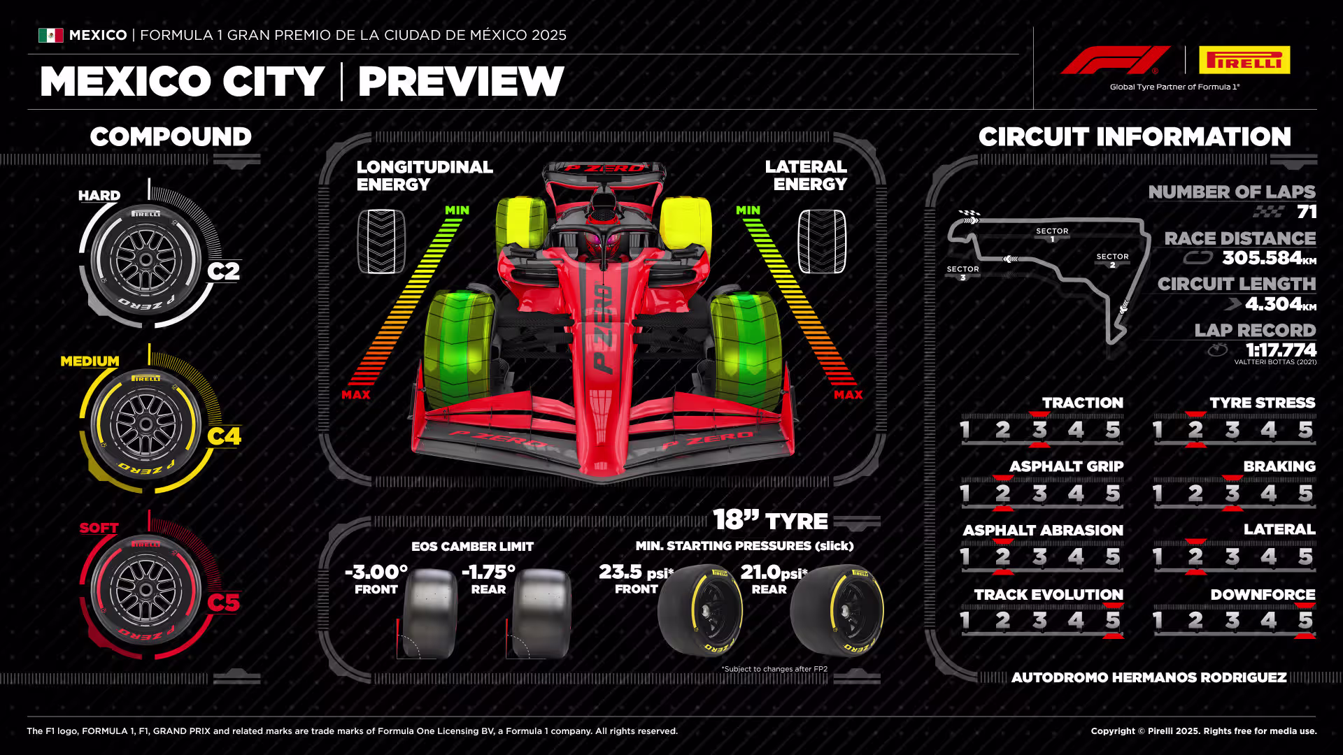 Con menos carga aerodinámica, las rectas largas y los sectores lentos exigirán un equilibrio fino entre velocidad y tracción. Además, la gestión del motor y de los neumáticos será determinante, especialmente si la temperatura del asfalto se eleva como suele ocurrir en la Ciudad de México.