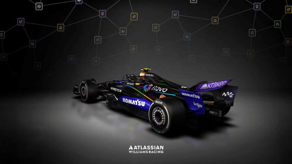Williams volvió a llamar la atención en el Gran Premio de Las Vegas con una decoración completamente nueva: un diseño totalmente negro con detalles de arcoíris, creado para celebrar el poder de Rovo, la inteligencia artificial desarrollada por Atlassian, su socio tecnológico principal. La escudería británica aprovechó la cita en Nevada para destacar los avances logrados desde el inicio de su colaboración en marzo de 2025.