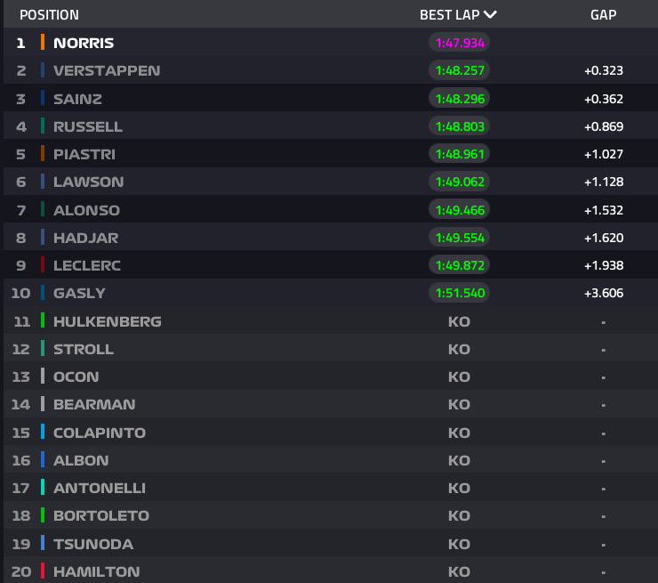 En la Q3, Norris marcó el ritmo desde su primera vuelta lanzada, mostrando una confianza notable en condiciones que castigaban el más mínimo error. El piloto de McLaren consiguió su 16ª pole position en Fórmula 1, la séptima del año, apoyado involuntariamente por su compañero Oscar Piastri, quien se salió de pista al final de la sesión y provocó una bandera amarilla que afectó a varios contendientes, entre ellos Isack Hadjar.