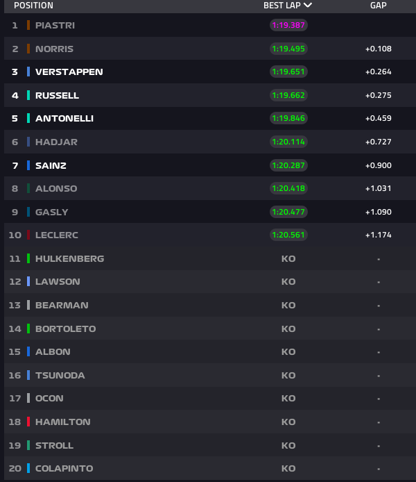 Norris había marcado el ritmo con un primer sector brillante en su primera vuelta lanzada, pero un desvío en la curva 2 lo obligó a abortar su último intento, dejando vía libre para que Piastri capitalizara. Max Verstappen, por su parte, encontró velocidad sobre el final para quedarse con el tercer puesto, a un cuarto de segundo de la pole. El neerlandés, a 25 puntos del líder, necesita superar a Norris para mantener vivas sus opciones al título.