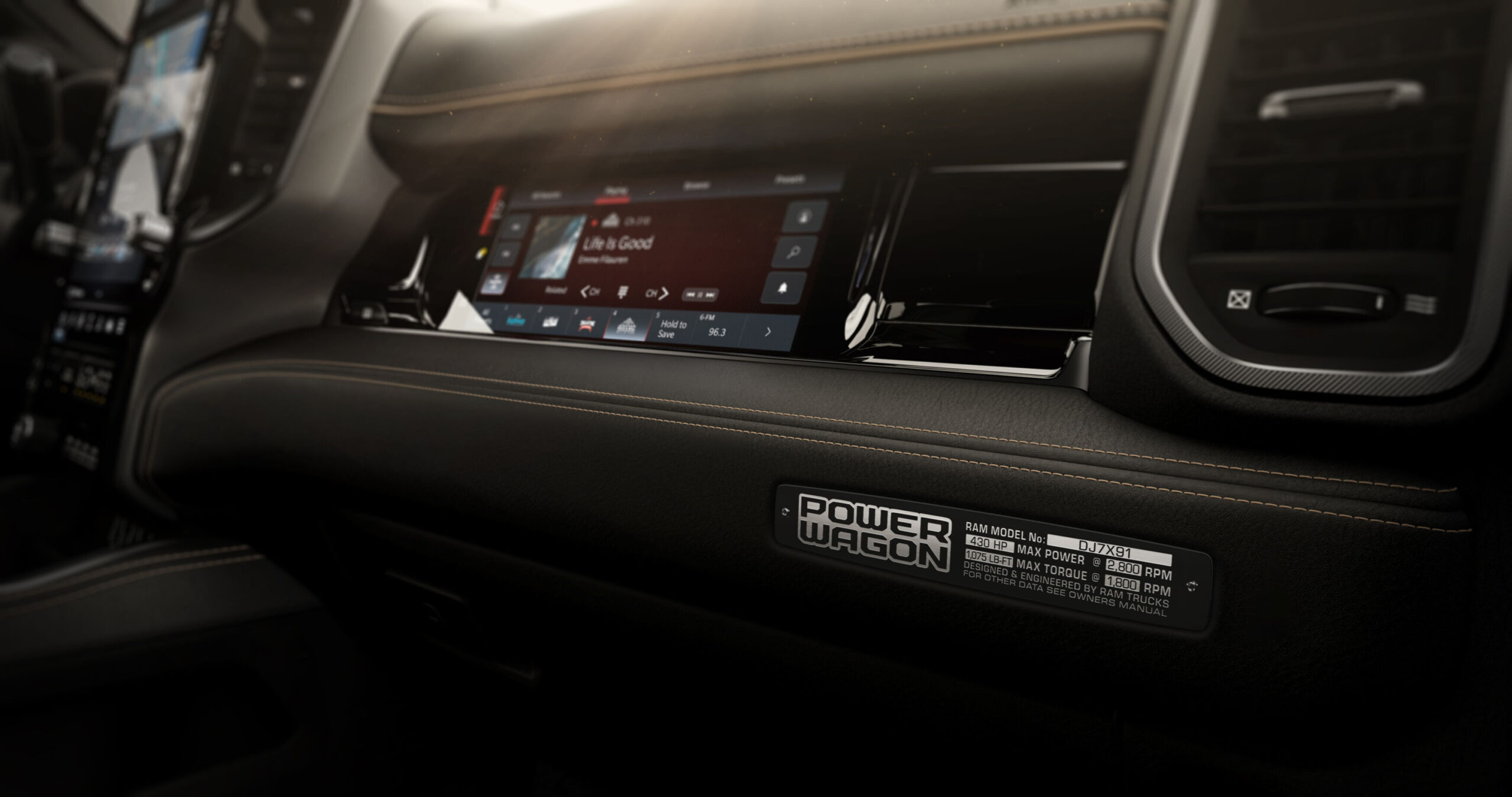 En el interior, la Power Wagon mantiene el estándar premium de la línea Heavy Duty. De serie incluye Uconnect 5 con pantalla de 12 pulgadas, con opción a una de 14,5 pulgadas, además de una pantalla exclusiva para el pasajero delantero.