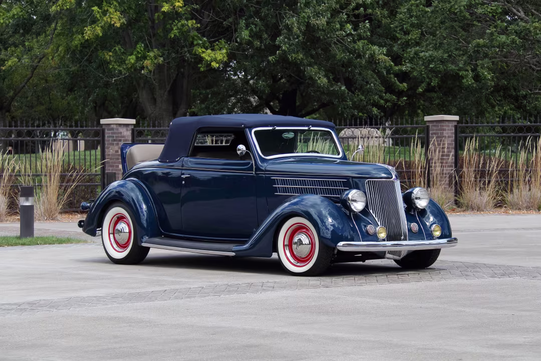 Le sigue el Ford Cabriolet 1936, refinado y crudo a la vez, impulsado por un V8 Flathead de 221 pulgadas cúbicas, con una presencia que captura perfectamente la dualidad de Moyer: pasión y precisión.