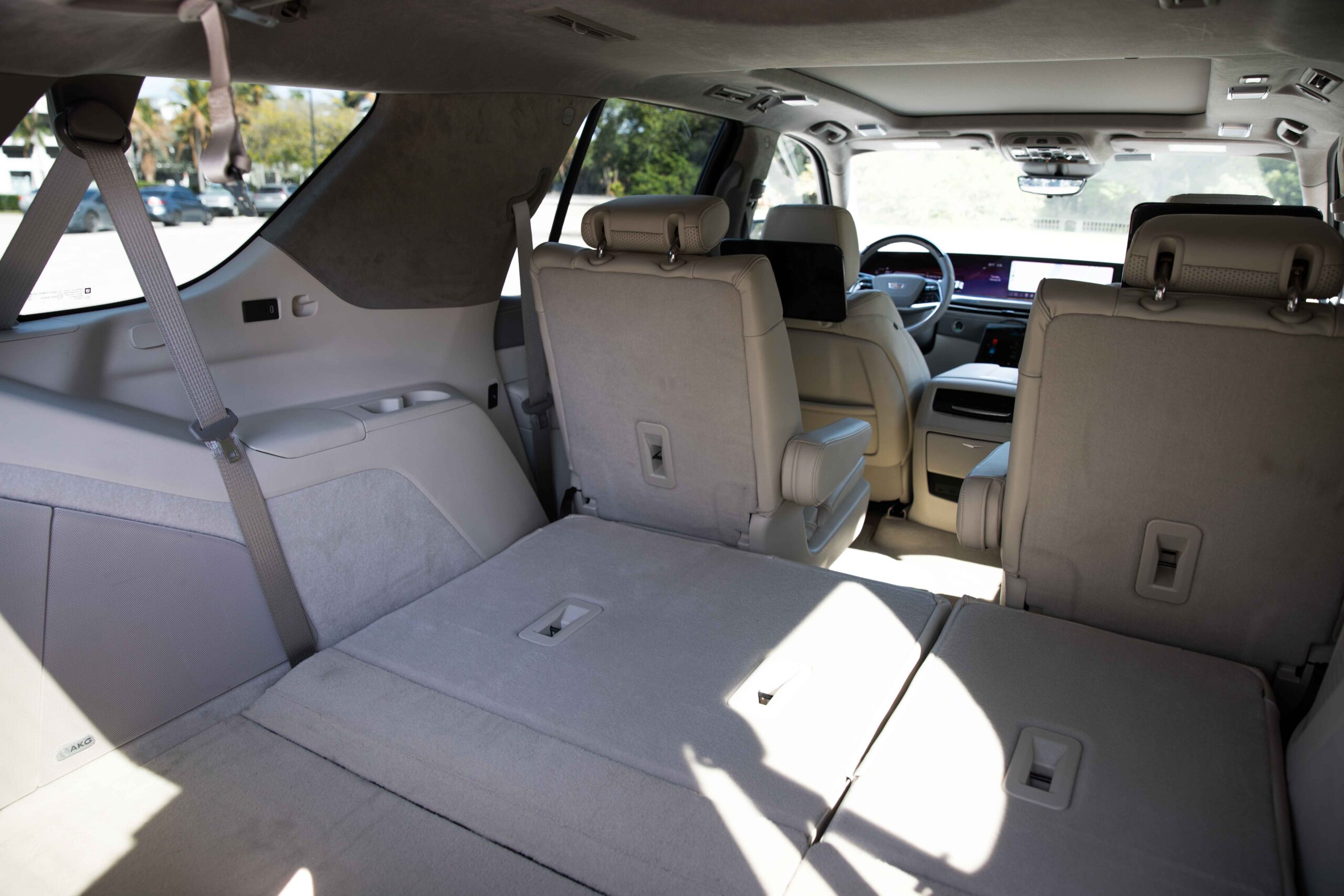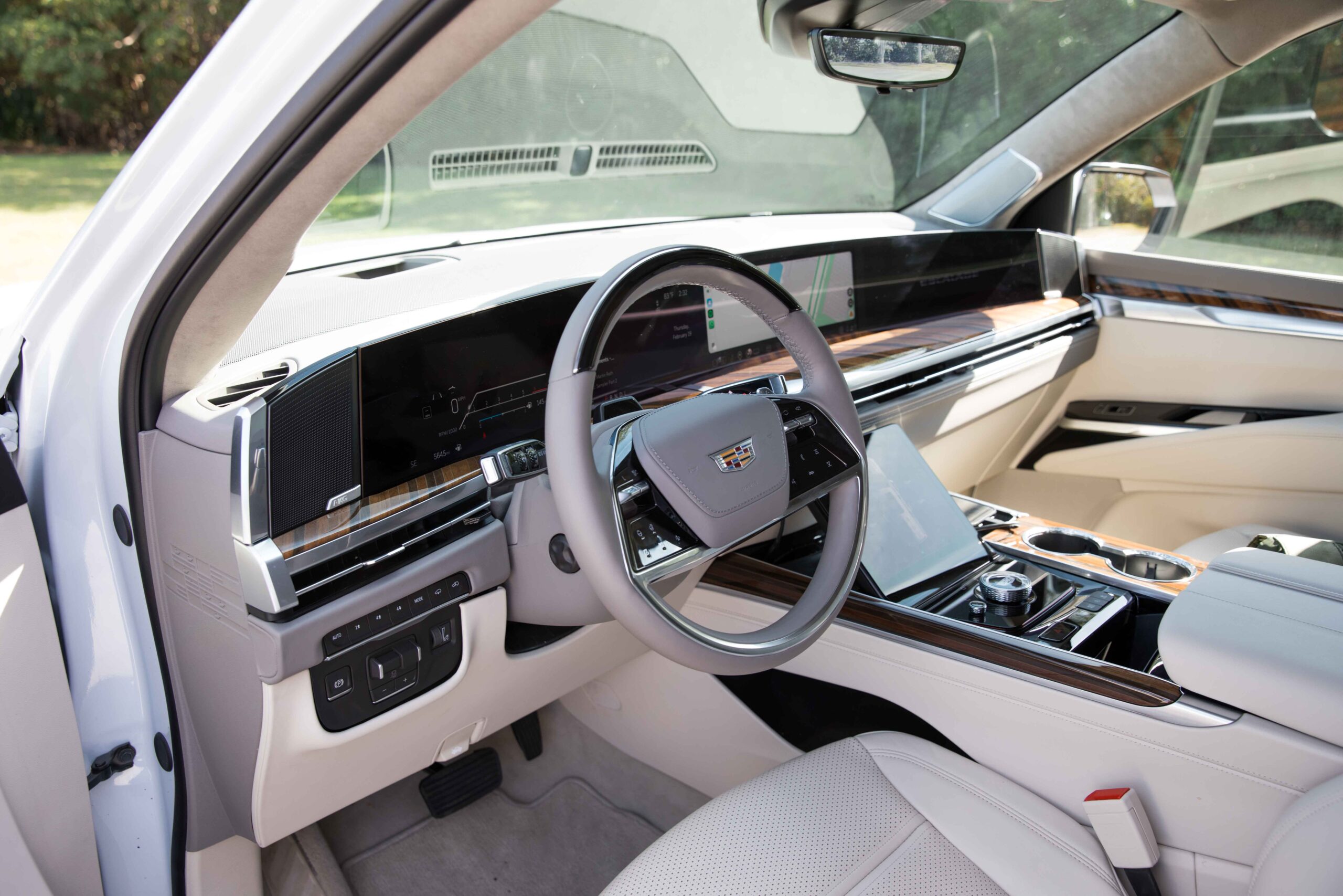 El interior se destaca por su lujo y tecnología de última generación. Los asientos delanteros están tapizados en cuero semi-anilina de alta calidad, con ajustes eléctricos de hasta 16 posiciones, ventilación, calefacción y función de masaje. Este nivel de comodidad convierte al Escalade en un vehículo ideal para viajes largos, tanto para el conductor como para los pasajeros.