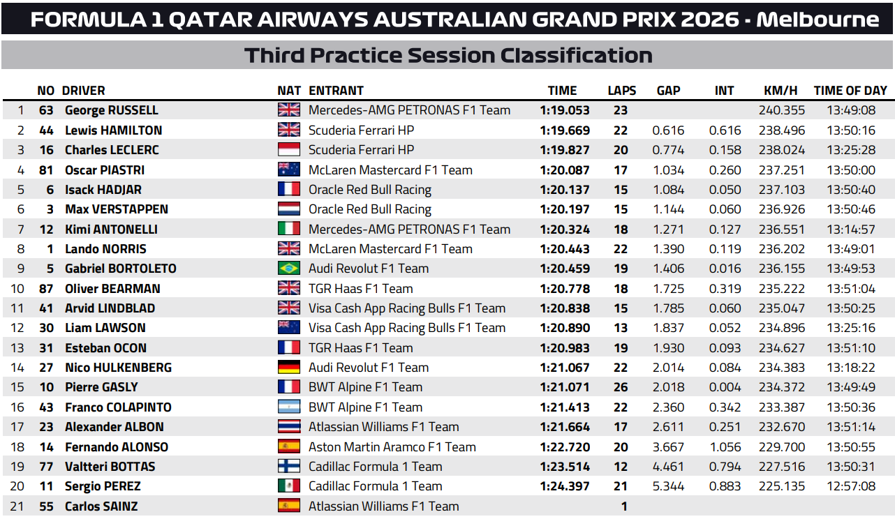 Russell logró aprovechar el momento y marcó un tiempo de 1:19.053, aproximadamente siete décimas más rápido que el mejor registro del viernes. Incluso utilizando neumáticos que ya habían iniciado una vuelta rápida antes de la interrupción, el británico terminó 0,616 segundos por delante del resto del pelotón, enviando un mensaje claro sobre el potencial de Mercedes antes de la clasificación.
