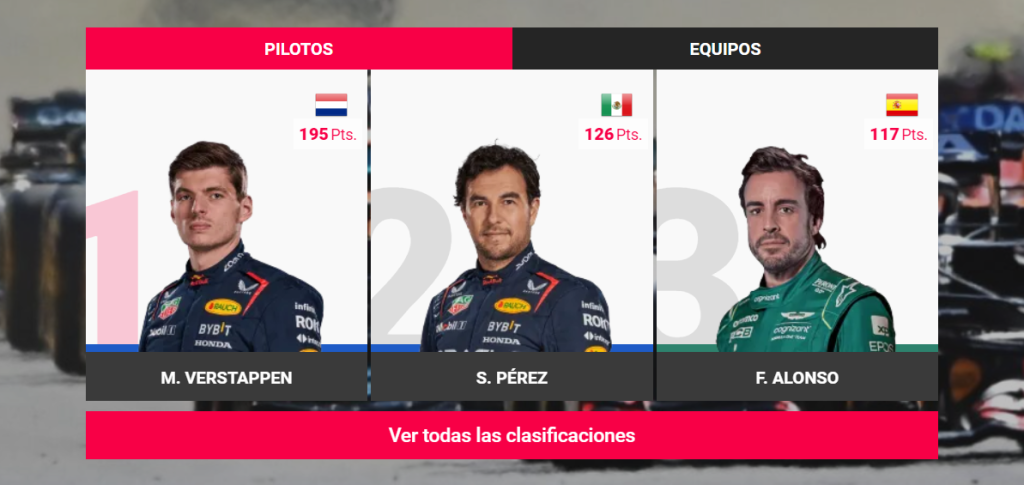 P Piloto Pts BH AS AU AZ MI IT MN ES CN AT GB HN BL PB IT SG JP CA US MX BR US AD 1 M. Verstappen 195 25 19 25 6+18 26 25 26 25 2 S. Pérez 126 18 25 11 8+25 18 16º 12 9 3 F. Alonso 117 15 […]